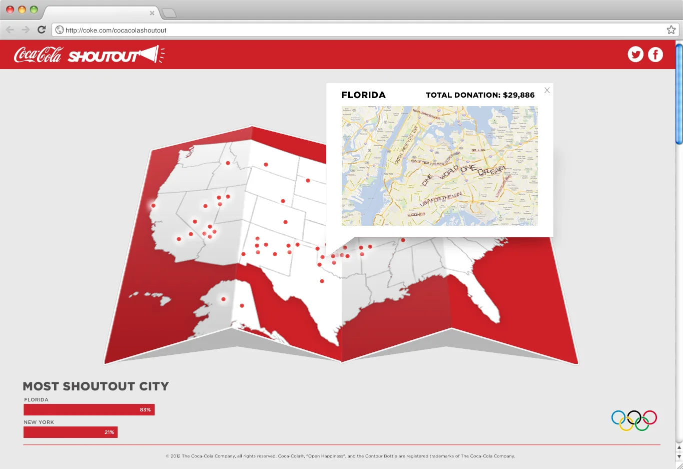 ShoutOuts are visualized through an engaging Google earth display. You can view all of the completed ShoutOuts, or watch others being created real-time. The more ShoutOuts you do, the more money Coca-Cola will match in donations.